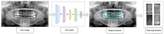 First, we create an image’s region of interest. To prevent encroachment on the teeth, we choose a region in the center of the image with a preliminary ratio compared to the original image of 1:1.4. The images are scaled to fit the Yolov3 model’s input size. The YOLOv3 model is used to suggest a tooth region, with Squeeze Net as the network’s base [,,]. We increase the number of detection heads and concatenate the output of each detection head with a suitable layer to generate better results. However, we must consider the model’s size to avoid overfitting and decrease complexity. Three detection heads are utilized in this detection model. A detailed illustration of the tooth segmentation process is shown in Figure 4. The fine-tuned parameters are given in Table 1.