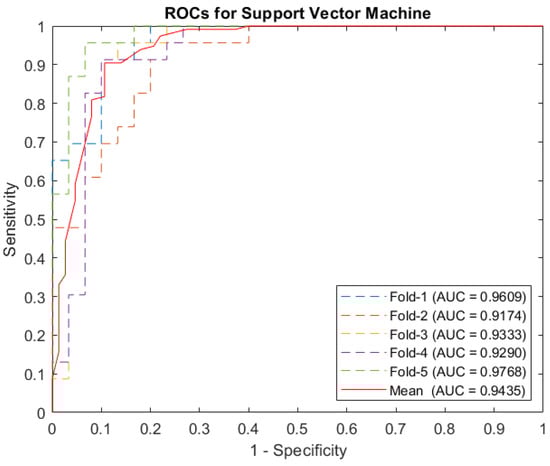 To develop and evaluate an effective caries detection system, the training and testing sets were randomly divided for cross-validation. The k-fold cross-validation was used to evaluate the proposed method’s robustness. The results demonstrate that the proposed method reliably adapts to unknown samples and covers the whole problem space. Additionally, k-fold cross-validation was used to avoid overfitting the proposed method to our testing data. It was applied to the method that best represents the issue, which is the SVM. The difference in accuracy between folds is around 6% (lowest accuracy: 90.57%, highest accuracy: 96.23%). All average values of accuracy, sensitivity, and specificity are higher than 93%, which indicates that our method is stable and reliable. We also computed the receiver operating characteristic (ROC) curves and area under the curves (AUC). The ROC curves, which describe the data for each fold and the average value, are presented in Table 4 and Figure 5.