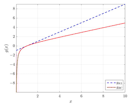 Equation (18) shows that the logarithmic transform is a special case of the KLT for , as it is a special case of the BCT. To understand how the transformation works, consider the special cases shown in Figure 1. The choice for the BCT is a simple linear shift of x to , whereas setting in the KLT leads to the nonlinear transformation . The latter tends to the linear transformation for . Figure 2 shows the two transformations for different values of . Notice that the KL transformation is symmetric with respect to . The inverse of the KLT is given by .