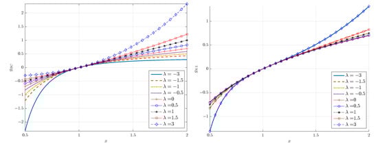 Plots of the Box–Cox and -logarithmic transform for ( is the Box–Cox parameter and is the deformation parameter of the Kaniadakis logarithm).