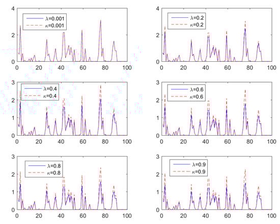 Figure 3 presents six realizations of the censored AR(1) model of Equation (24) using both the inverse BCT and KLT as the nonlinear transformation , with equal values of and in each frame. The AR(1) model of Equation (24) is applied with and . The time series exhibit intermittent behavior due to censoring. The difference between BCT and KLT is negligible for small values of . For , both transforms yield a censored lognormal process, because and converge to the normal exponential for . The KLT peaks become progressively higher compared to the BCT peaks as (and increase. This behavior is due to the following inequality between the inverse transforms