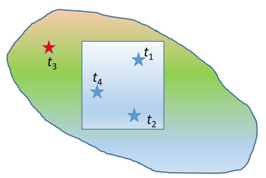 One mechanism that can lead to the emergence of long tails is due to limited size of the observation window as illustrated in Figure 4. Consider an observation domain (indicated by the square domain in the center) which is part of a larger interconnected system (denoted by the oval-shaped area). Let us assume that in the entire system, the failure events occur at times . Furthermore, assume that the interevent times , , and follow a distribution which does not necessarily have a heavy tail. However, since the observed system involves only the square domain, the observed interevent times are and ; the latter results by adding the true interevent times and , leading to a larger period of quiescence than if the entire system were taken into account. The repeated occurrence of events outside the observed domain can thus inflate waiting times and transfer probability weight from the low and middle range of the probability distribution to the right tail.