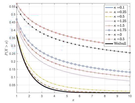 The power-law tail gives the -Weibull an advantage over the classical Weibull distribution for systems with algebraic decay of the right tail of the distribution. Figure 5 compares the tails of the survival functions for the Weibull and -Weibull models. Note that for is practically indistinguishable from the Weibull survival function.