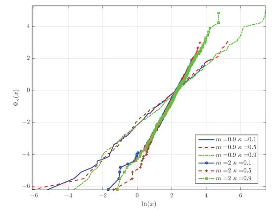 If we define the function , it follows from Equation (25b) that . This relation suggests a graphical approach to test if a given dataset follows the -Weibull distribution: it suffices to test if the scatter plot of versus (for ) is concentrated around a straight line with slope equal to m. This property allows a quick visual test of the fit between the data and the -Weibull distribution which is analogous to the widely used Weibull plot [68].