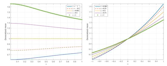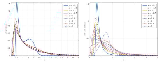 Plots of the Box–Cox (left) and -logarithmic (right) transform for different values of ( is the Box–Cox parameter and is the deformation parameter of the Kaniadakis logarithm).