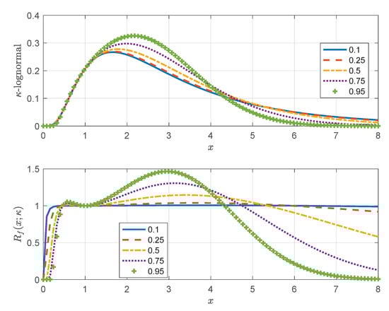 Let , where is the sample space, is a -field of subspaces of , and P is a probability measure, define a probability space. A real-valued, scalar random variable is defined by the mapping , where is the set of real numbers [47]. Furthermore, a stochastic process indexed by the time is defined by the mapping . In the following, the dependence on the state index is suppressed for convenience. In addition, the random variable X represents a load or the waiting time between consecutive “failure” events (e.g., earthquakes), or some other asymmetrically distributed variable.