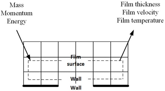 where and h represent the film thickness and enthalpy respectively. The subscript s in the means that the discretization and equation solving is only performed on the extruded surface mesh. The right-hand-side terms of Equations (6)–(8) represent the source terms of mass, pressure, momentum and energy caused by droplets impingement and splashing, respectively. The detailed splashing model (terms with subscription ) is proposed by Bai [25], which is already available in OpenFOAM. The mass source term is the collected mass per unit time per unit area. The momentum source terms , and the enthalpy source term are associated with the mass source term . The corresponding velocity and temperature in estimating momentum and enthalpy is taken at impinging time. The momentum source is splitted into the tangential and wall-normal components, which are represented by and respectively.