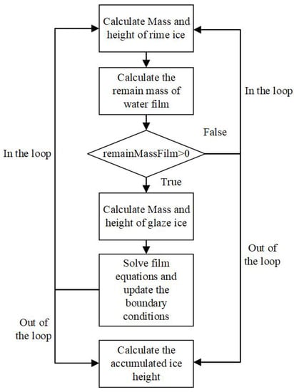 The ice accretion calculation is a multi-stage process with both outer loop (mentioned in Section 2) and inner loop calculation. The inner loop calculation is realized by splitting one outer step into several inner steps when it comes to calculating ice accretion and solving film equations, which is designed to predict the water flow more accurately since the glaze ice accretion is coupled with the film calculation. As shown in Figure 4, rime ice accretion is first solved in each inner step with the limitation of . Glaze ice accretion occurs when there is accumulated water left. Furthermore, the film equations are solved after glaze ice accretion is calculated with the up-to-date source terms. The film thickness, film velocity and film temperature are obtained for the calculation of the next loop.