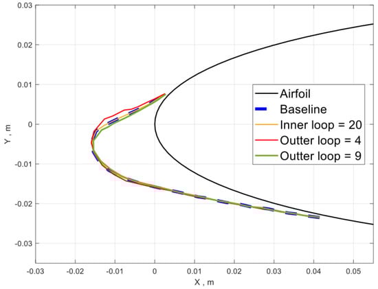 The mesh sensitivity study on the aerodynamic field is given in Section 2.1. In this section, the parameter sensitivity study on the ice shape is carried out using case 1 in Section 3.2. Figure 5 shows the predicted ice shapes using different numbers of inner loops and outer loops. The baseline configuration uses 6 outer loops (60 s/step) and 10 inner loops (6 s/step) for the total icing time of 360 s. The number of outer loops controls the frequency of aerodynamic and droplet trajectory evaluations. Increasing the number of outer loops to 9 (the 40 s/step) shows little effect on the ice shape while decreasing the number of outer loops to 4 (90 s/step) shows some difference. Increasing the number of inner loops reduces the time step size in evaluating the water film flow and ice accumulation. Doubling the number of inner loops shows a negligible effect on the final ice shape.