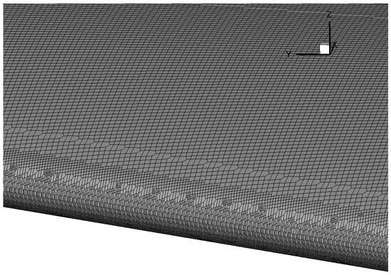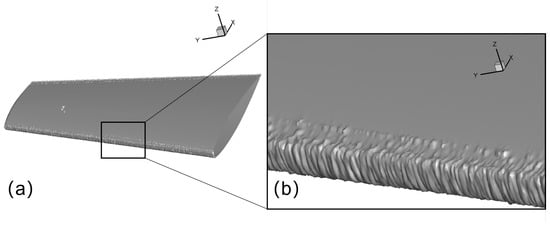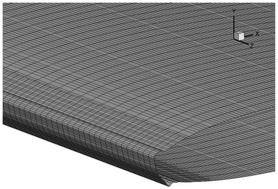The ability to accurately predict ice shape is validated on the NACA 0012 airfoil, with comparisons made to the ice shapes measured in experiments [26,27]. The geometry is a 2D NACA 0012 airfoil extruded in the spanwise direction. The visualization of the discretization on airfoil surface is shown in Figure 7. The sideview of this mesh is previously given in Figure 2. Note that the meshing tool snappyHexMesh only works for 3D mesh, the mesh on the leading edge is firstly refined in all directions to ensure the ability to capture ice growth accurately. Then an extrusion based on the side patch is required to generate a mesh that is homogeneous in the spanwise direction.