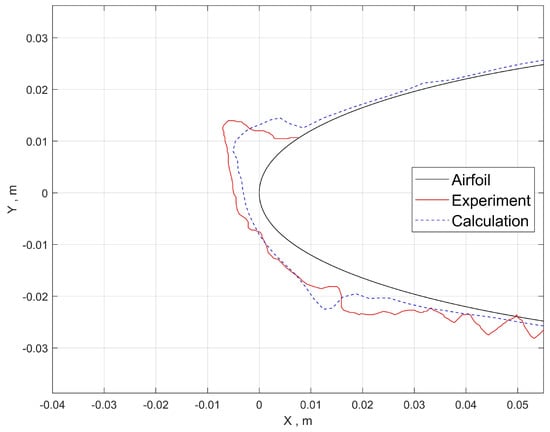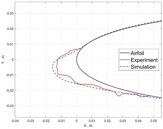 The validation results of ice shape for cases 1 and 2 are shown in Figure 9 and Figure 10. The results calculated with the Eulerian method show the homogeneity of ice shape along the spanwise direction, which is a nature consequence of the previously mentioned distribution of collection efficiency. The 2D ice shape fits well with the experimental results, which proves that the tracking and collecting method, the film model and the ice accretion model are feasible in predicting ice shapes under small-size droplet conditions.