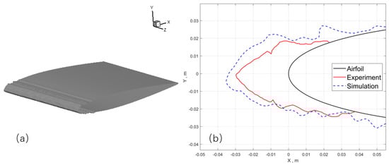 Case 3: (a) global view of the predicted airfoil with ice; (b) Spanwise-averaged ice shape compared to experiment.