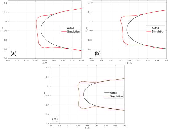 The spanwise-averaged 2D ice shape (Figure 12b) implies that the collection efficiency is slightly larger than the experimental one. Since the main feature of the ice shape is captured, it is still reasonable considering the difficulty in numerical prediction SLD icing and the complex physics associated with SLDs. It proves that the icing simulation method is also feasible in predicting ice shapes under SLD conditions with the Lagrangian method, but the accuracy remains to be improved.