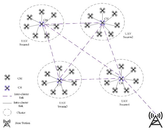 The high mobility of the UAV nodes in FANET makes it more frequent to enter and exit the network, which causes difficulties in the establishment and maintenance of the network and makes it difficult to control and manage the UAVs efficiently as their scale increases. As shown in Figure 1, dividing the network into clusters can help solve the above problems. The division process is based on different parameters, and UAVs are divided into different cluster groups that can communicate directly with each other and share channels and resources within the effective communication range of the nodes. Based on different election parameters, the UAV with the highest performance is selected as the cluster head (CH), and the rest of the UAVs in the group are cluster members (CM). The CH nodes are responsible for inter-cluster intra-cluster data forwarding in the UAV network, and the nodes transmit packets to the CH, which forwards them to the destination node or base station. In this way, the number of control packets will be reduced. However, the communication burden of CH will be increased because it needs to transmit data between clusters and manage CMs. Therefore, the division of clusters and the selection of CHs, as well as efficient cluster management strategies, are essential to achieve reliable communication and improve network performance in a hierarchical network.
