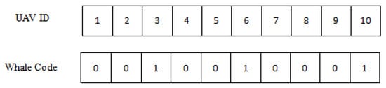 As shown in Figure 2 below, the whales are binary encoded. Cluster head election is performed for N UAVs, each UAV node has a unique ID number, and a whale represents a feasible solution to the cluster head election problem, namely a cluster head election scheme. The position of the whale at a certain moment is an N-dimensional binary vector, and the ith bit of the encoded whale is 1, which means that the UAV is elected as a cluster head, and 0 means it is a non-cluster head UAV. The UAVs with IDs 3, 6, and 10 in the figure below are elected as cluster heads.