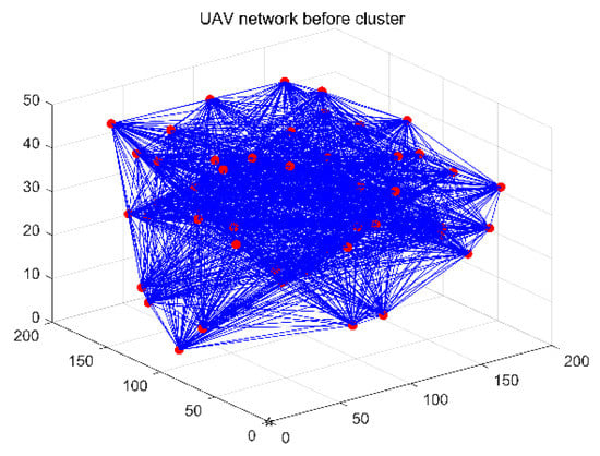 Suppose N UAVs are randomly deployed in a network area of 2000 m × 2000 m × 500 m, UAVs have unique identification IDs, node locations are (x, y, z), base station location coordinates are (0, 0, 0), all UAV nodes have the same computing power, communication power, and initial energy , each UAV has a sensing radius R of 250 m and a communication radius r of 300 m. Now we need to divide N UAVs into K UAV clusters for lower energy consumption and higher performance, and is the set of all UAV nodes, is the set of all CH nodes.