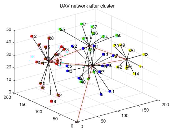Due to the limited bandwidth of the UAV network communication module, when the number of clusters is too small, the number of nodes in the cluster becomes more, and the data transmission is prone to congestion, and the intra-cluster throughput will be reduced; if the number of clusters is too large, it will lead to higher communication and transmission delay, and the bandwidth is not fully used. Therefore, in order to make full use of the network bandwidth, the intra-cluster and inter-cluster network throughput should be balanced. and are the intra-cluster and inter-cluster bandwidths, where the number of CMs in the jth cluster is . The optimal number of CHs should satisfy the following bandwidth constraints: