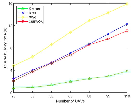 Cluster building time is the time spent to execute the clustering algorithm to select CH and form clusters and represents the computational complexity of the algorithm. The shorter the build time, the lower the energy consumption. Figure 5 depicts the relationship between cluster building time and the number of UAVs, from which it can be seen that the cluster building time increases with the number of UAVs in the network. The CSBWOA is slightly better than BPSO. The K-means-based clustering scheme produces only one solution and updates to the optimal global solution sequentially, so its cluster building time is shorter. Although CSBWOA takes slightly longer to build, its optimal CH selection has good performance in improving the network performance.