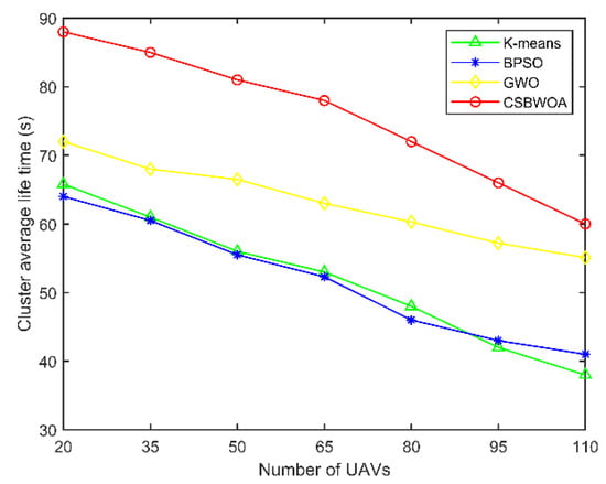The cluster lifetime is the time interval between the election of CHs and cluster formation and the next re-election of CHs to divide the cluster. The longer the cluster lifetime, the fewer the number of cluster reconfigurations. Figure 6 depicts the effect of the number of UAVs on the average cluster lifetime, which gradually decreases as the number of UAVs increases. However, it can be seen from the figure that the average cluster lifetime of the proposed CSBWOA is longer because the proposed scheme cluster division is more reasonable. The optimal CH is selected by considering energy consumption and distance and cluster load balancing, which reduces the number of cluster reconfigurations and maintains a stable cluster structure, resulting in a longer cluster lifetime.