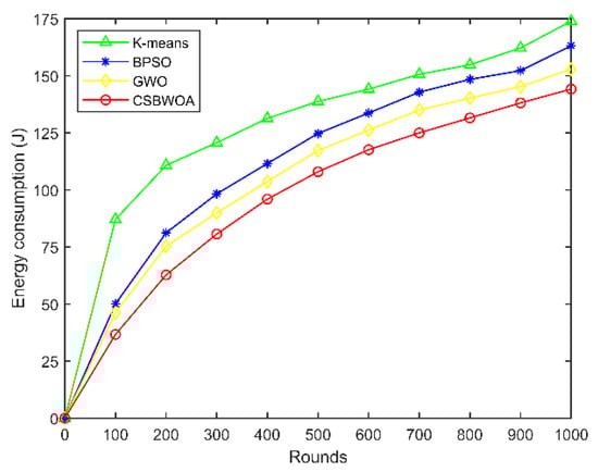Figure 7 depicts the variation curves of the energy consumption of the three algorithms with the number of rounds when the number of UAVs is 35. It can be seen from the figure that as the number of rounds increases, the energy consumption of CSBWOA is lower compared with the other algorithms. This is because the residual energy of UAVs and the overall cluster load balancing are considered in the optimal CH selection; the cluster maintenance policy is also set to maintain the cluster stability, which avoids frequent cluster reconfiguration to a certain extent and thus consumes less energy.