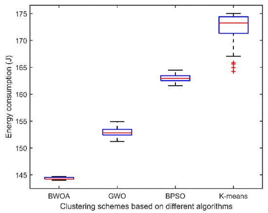 The dispersion of the energy consumption values for all clustering schemes independently simulated 30 times for the scenario with the number of UAVs of 35 is shown in Figure 8. The energy consumption of the BWOA-based clustering scheme is lower among all schemes. And it can be seen from the boxplot that the proposed scheme in this paper has the smallest standard deviation compared with the clustering schemes based on other algorithms.