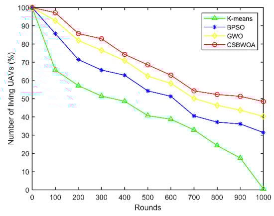 The UAV survival rate is the ratio of the number of surviving UAVs to the total number of UAVs. Figure 9 shows the results of node survival rate comparison of different algorithms when the number of UAV nodes is 35. It can be seen from the figure that the survival rate of UAVs in the CSBWOA is higher than in other algorithms as the number of rounds increases. This is because, due to the optimal CH selection, the algorithm proposed in this paper can better balance the energy consumption of UAVs, which prolongs the lifetime of UAVs and thus has a higher survival rate.