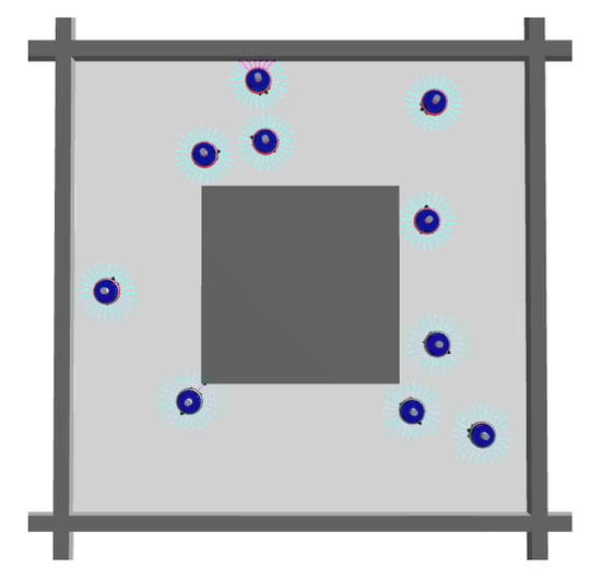 Top view of the arena used for Task I. The gray objects are the obstacles, and the blue objects are the robots. The arena consists of a square perimeter with a square obstacle in the center.