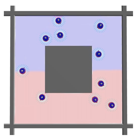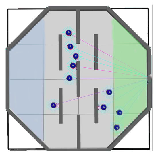Task II—The second task differs from the first task in the presence of two virtual regions that subdivide the arena, as depicted in Figure 2. Each robot will be assigned to a region in which to navigate and avoid obstacles, avoiding entering the wrong one. The score is calculated as in Equation (1) by introducing a penalty factor which takes the value 1 when the robot is in the correct region and otherwise. The resulting objective function is the following: