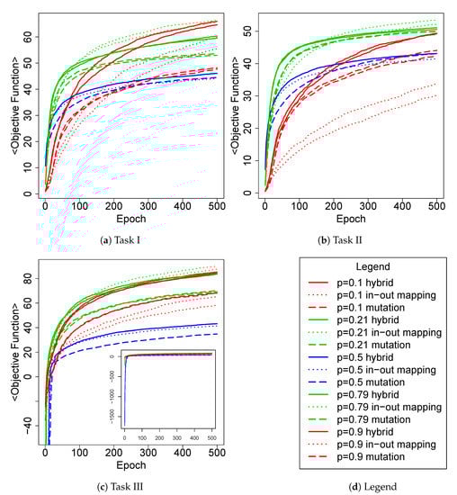 As for property (ii), in our experiments, “robustness against mutation” has to be read as the aptitude of the network to react with slight behavioral changes to local permanent perturbations of its structure. In other words, on average, the dynamics of the network should not be profoundly changed by local structural perturbations. “Phenotypic innovation” counterbalances robustness in that it should enable changes that carry novelty in the dynamics of the network. In our experimental setting, this corresponds to the possibility of introducing adjustments to the network such that it can improve its behavior. Therefore, the trade-off between robustness against mutation and phenotypic innovation is indirectly assessed by the objective function improvements along the adaptive epochs: The larger the area under the curve, the better the trade-off between robustness and innovation—under structural adaptation, i.e., the Mutation mechanism.