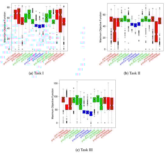 In Figure 5, we report the distributions of the maximum objective function scores obtained by the robots along their epochs of adaptation, which are grouped by task. These data also confirm that Boolean networks generated with perform poorly on average. Indeed, the best robots in this parameter setup fail to achieve high values of the objective function across all the tasks. In addition, we can state that at least for this kind of analysis, there is no clear winner between the critical and ordered networks, which are the best configurations for the previous analysis. However, the box-plots seem to suggest that as the task difficulty increases, i.e., from I to III, the relationships between the two distributions gradually change in favor of the critical configuration. As regards the adaptation mechanism, both cases of critical RBNs (namely, and ) with in–out mapping present median values comparable to (in Task I) or higher to (Task II and III) other adaptation mechanisms.
