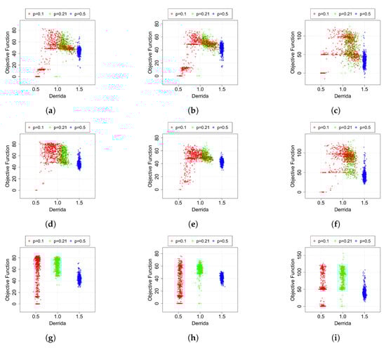 In Figure A1, the scatter plots of Derrida values (x-axis) against the relative objective function scores (y-axis) for the remaining bias values () are reported.
