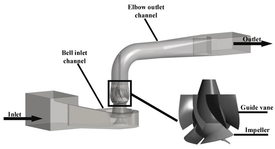 Figure 1 shows the three-dimensional model of the mixed-flow pump device, including the bell inlet channel, elbow outlet channel, guide vanes, and impeller. The design flow rate Qdes was 336 L/s, the rated rotation speed n was 1218.8 r/min. The diameter of the impeller was 320 mm, the number of impeller blades Z1 was 3, and the tip clearance of the impeller was 0.15 mm.