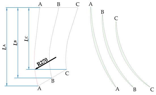 Meridional shape of the guide vane blade (A-A, B-B and C-C: section of guide vane blade at shroud side, middle and hub side; LA, LB and LC: length of guide vane at section A-A, B-B and C-C).