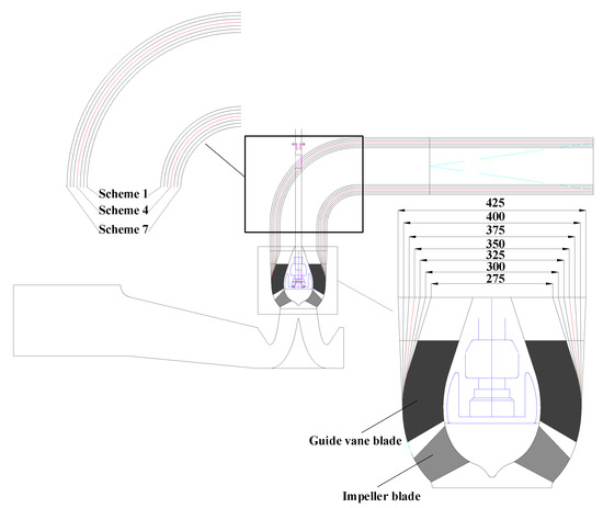 In this paper, only the meridian profile of the guide vane and the outlet channel were changed. Figure 2 shows the meridional shape of the guide vane blade and Table 1 shows the specific parameters of the blade. The shroud profile of the guide vane consisted of an arc with a radius of 270 mm and a straight line. With the section A-A, B-B, and C-C unchanged, changing the slope of the straight line led to variable diameters of the guide vane outlet Dgvo, which were 275, 300, 325, 350, 375, 400, and 425 mm. The initial size was 350 mm. The guide vane was modelled by CF turbo. In order to ensure that the outlet channel was smoothly connected with the guide vane, seven schemes were also set for the outlet channel, as shown in Figure 3.