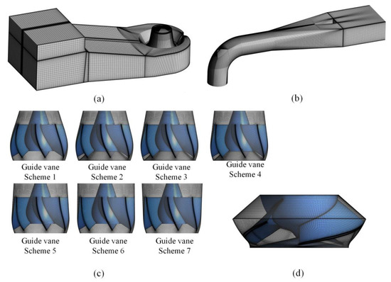 Mesh of the computation domain: (a) inlet channel; (b) outlet channel; (c) guide vane with various meridians; and (d) impeller.