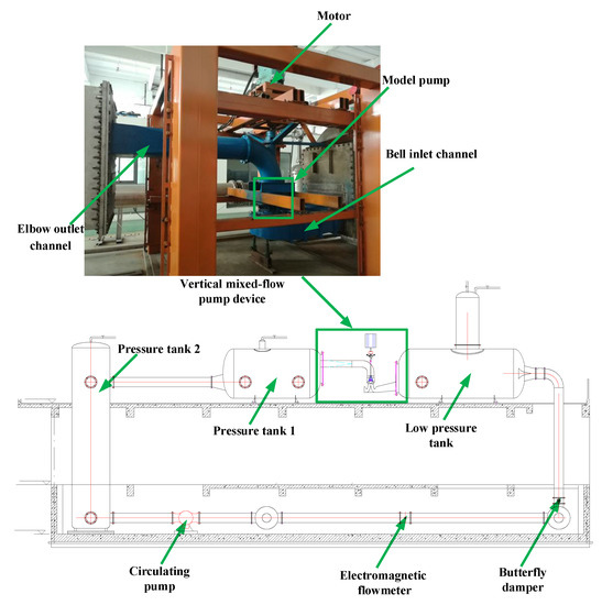 In this paper, the energy characteristic curve of the pump device model was measured by a four-quadrant multi-function test rig of hydraulic machinery. The test bench adopted a vertical structure, as presented in Figure 5. A flowmeter with measurement uncertainty EQ of ±0.2% was employed to measure the flow rate, and the measurement uncertainty of the head detector EH was ±0.1%. In the range of 1–500 Nm, the uncertainty of the torque measurement EM was ±0.1% and the uncertainty of the rotating speed measurement En was ±0.1%. The systematic uncertainty of the test bench ES consisted of the head, shaft power, and flow measurement uncertainty, which can be calculated by Equation (9):