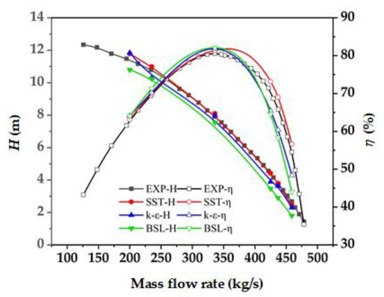 In Figure 6, a comparison is made between the values of the experiment and simulation in different turbulence models. As Figure 6 shows, the simulation value in the SST turbulence model is closer to the experimental value, while the simulation value in k-ε and BSL turbulence models is significantly smaller than the experimental value at large flow rate condition. Therefore, in this paper, the SST turbulence model is used to simulate the mixed-flow pump device. For simulation results in SST turbulence simulation, under the design flow, the relative error between the simulated head and the experimental value was less than 2.5%, and that between the simulated efficiency and the experimental value was less than 1%. The maximum relative error under other conditions was less than 6%. This indicates that the consistency between the numerical simulation value and the experimental measurement value met the requirements, and the numerical simulation results are reliable.