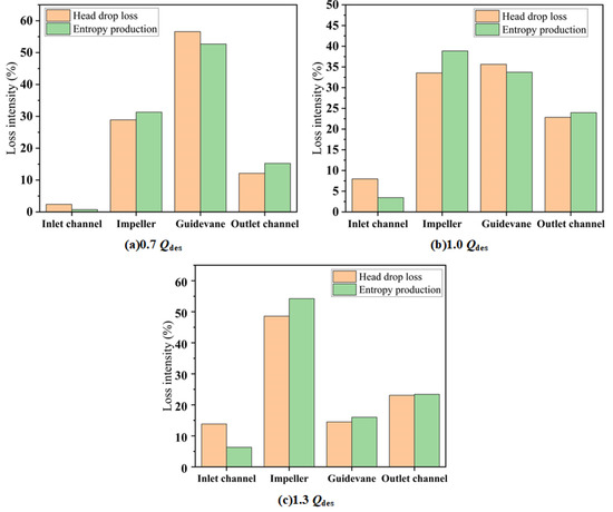Comparison of hydraulic loss and entropy production for each component at various flow rate conditions: (a) 0.7 Qdes; (b) 1.0 Qdes; and (c) 1.3 Qdes.