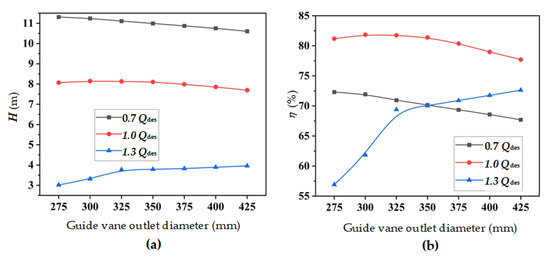 External characteristics of a mixed-flow pump device with different guide vane outlet diameters: (a) head; and (b) efficiency.