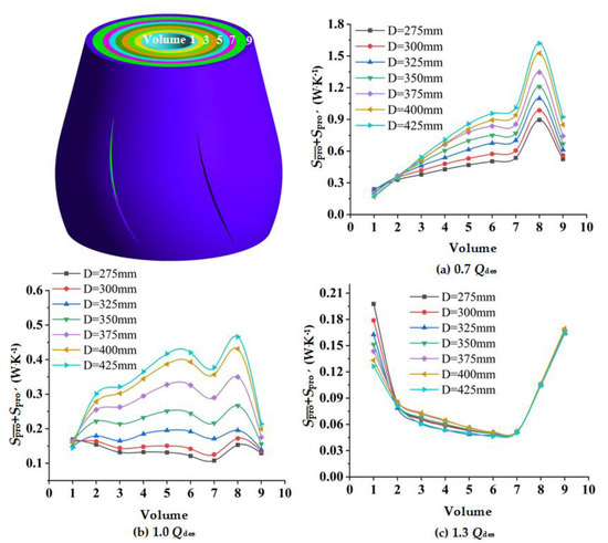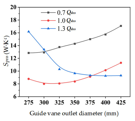 The entropy production of the mixed-flow pump device with different guide vane outlet diameters under different flow conditions, is shown in Figure 9. At 0.7 Qdes, the entropy production of the device increases with the increase of Dgvo, and it increases by 33% as Dgvo expands from 275 mm to 425 mm. At 1.0 Qdes, when Dgvo ranges from 300 to 325 mm, the entropy production is the minimum. When Dgvo < 300 mm, the entropy production raises with the decrease of Dgvo, and when Dgvo > 325 mm, the entropy production raises with the increase of D. At 1.3 Qdes, the entropy production of the device declines as Dgvo boosts, when Dgvo expands from 275 mm to 425 mm, it reduces by 42.5%.