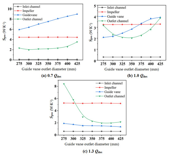 At 0.7 Qdes and 1.0 Qdes, the entropy production inside of the guide vane raised as Dgvo increased, while at 1.3 Qdes, there was no obvious change to entropy production. As for the outlet channel, at 0.7 Qdes, with Dgvo in the range of 300 mm to 375 mm, the entropy production showed little change, but when Dgvo > 375 mm, the entropy production increased. At 1.0 Qdes, when Dgvo was smaller than 350 mm, the entropy production increased as Dgvo decreased. When Dgvo was 350 mm, it reached the minimum. When Dgvo was larger than 350 mm, the entropy production increased as Dgvo increased. At 1.3 Qdes, when Dgvo < 325 mm, the hydraulic loss inside of the outlet increased rapidly.