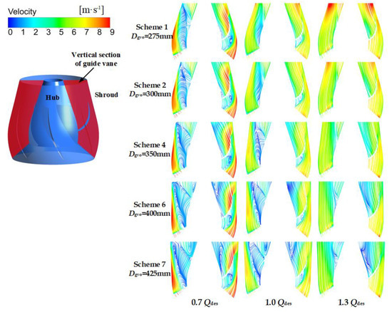 Velocity streamline of guide vanes with different meridians at various flow rate conditions.
