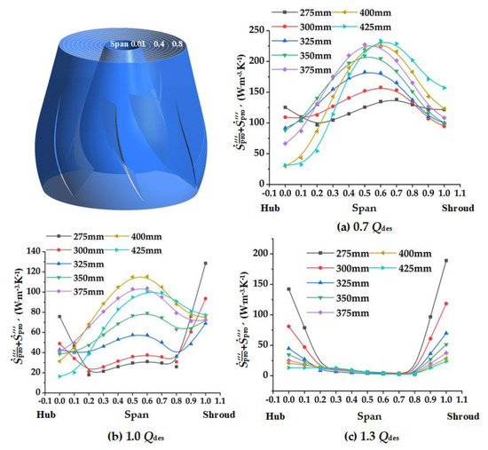 Total entropy production rate of the guide vane outlet under various flow rates: (a) 0.7 Qdes; (b) 1.0 Qdes ; and (c) 1.3 Qdes.