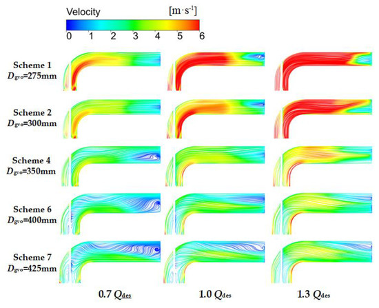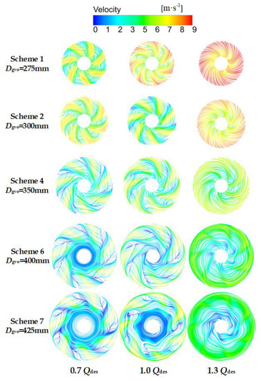 There is an interference effect between the guide vane and outlet channel, so it is necessary to analyze the entropy production distribution at this interface. In this section, 11 turbo lines were constructed from hub to shroud, and the average total entropy production rate in these lines was calculated by adding direct dissipation and indirect dissipation Figure 13 depicted the spread of the total entropy production rate at the guide vane–outlet channel interface. As shown in Figure 13, under all flow conditions, the total entropy production rate near the hub decreases with the increase of Dgvo. According to the velocity streamline in Figure 14, this is because the increase of Dgvo enlarges the low velocity area near the hub. Under 0.7 Qdes, at span 0.2–0.6, flow separation intensified with the increase of Dgvo, leading to the increase of total entropy production rate, which reached a peak near span 0.6. A similar situation occurs at 1.0 Qdes, but there is a significant difference. The flow separation of Scheme 7 is weaker than that of Scheme 6, so the total entropy production rate of Scheme 7 is smaller. When Dgvo < 300 mm, the total entropy production rate near the shroud decreases with the increase of flow rate, but when Dgvo > 300 mm, the opposite trend appears.