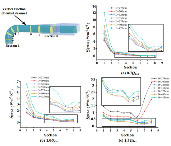 Entropy production of different sections in outlet channel under various flow rates: (a) 0.7 Qdes; (b) 1.0 Qdes; and (c) 1.3 Qdes.