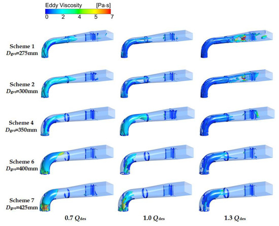 The vortex identification technology based on λ2 criterion [28] is used with the aim of observing the vortex structure. The study of Mariotti [29] shows that λ2 is a very powerful tool in the comparison between the different configurations in terms of vortical structures. According to the study of Ji [30], it is feasible to set the threshold value as 175 s−2 to study the vortex structure of the mixed-flow pump. As is shown in Figure 17, under all flow rate conditions, with the increase of Dgvo, the vorticity of the outlet channel decrease, at the same time, the eddy viscosity augment at 0.7 Qdes and 1.0 Qdes, but there is not obvious raise at 1.3 Qdes. It is worth noting that when Dgvo < 300 mm, a region of high eddy viscosity appeared in the second half of the outlet channel, which resulted in the increase of entropy production. A conclusion can be drawn by comparing Figure 16 and Figure 17, when the velocity gradient of liquid is too large, vortex will be generated and entropy production will increase. Moreover, the greater the velocity gradient is, the larger the eddy viscosity is, and the higher the entropy production is.