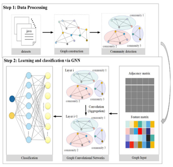 This model primarily examines software from the perspective of the complex network, abstracts the software into a graph network, learns the representation vector of nodes using a graph neural network, and categorizes nodes on the basis of the representation vector. Figure 1 depicts the overall layout of the framework. Basically, it consists of two steps. Processing the data is the first phase, followed by using the class as the research granularity, abstracting the software source code into multiple nodes, and creating a network or graph using the dependencies among classes. Lastly, community detection techniques are used to split the graph into various subgraphs. The edge-link relationship is stored in the adjacency matrix in the second phase, and the adjacency matrix and the node-level features are seen as the structural information of the graph, which are considered as input to the graph neural network to obtain the representation vector of the node. Lastly, the multilayer perceptron (MLP) is used to classify the nodes. Section 2.4.1 analyzes the first part of Figure 1, and Section 2.4.2 analyzes the second step of Figure 1.