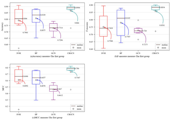 It can be seen from Table 5 that the proposed model has achieved good experimental results in terms of accuracy, F-measure, and MCC in most datasets. In terms of accuracy, it was 7.6% higher than SVM, 5.8% higher than BP, and 13.6% higher than GCN. The F-measure was 10.7% higher than SVM, 7.8% higher than BP, and 13.1% higher than GCN. The MCC index was 12.5% higher than SVM, 12.7% higher than BP, and 27.4% higher than GCN. The data were analyzed from two aspects: