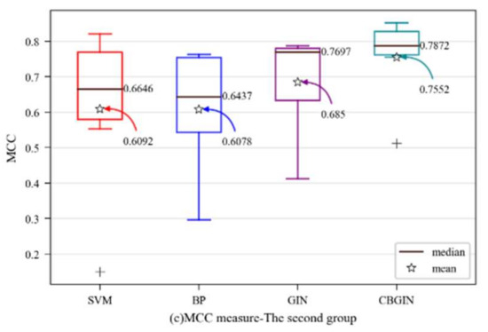 Similarly, in order to visually observe the performance of the CBGIN algorithm, various evaluation metrics were determined as box plots. The y-axis shows the evaluation metric score, while the prediction method is on x-axis in Figure 4. For better analysis, the mean and median in the figure are marked.