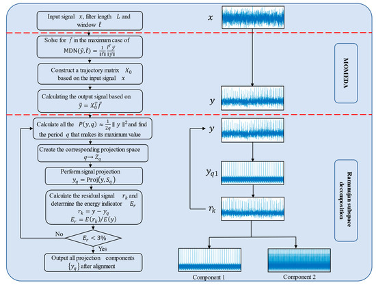Ramanujan subspace decomposition is able to project the signal into a spatial matrix and obtain physically meaningful signal components. However, when the signal has strong noise, the decomposition will become less effective. Moreover, it is not possible to perform adaptive decomposition of the signal. To address these problems, we introduced MOMEDA into the subspace decomposition and iterated the adaptive decomposition by calculating the residual signal. The flow chart of the proposed new method is shown in Figure 1.